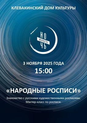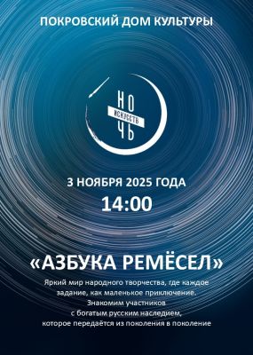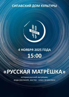 Акция приурочена к празднованию Дня народного единства и проходит под девизом «Искусство объединяет». В этом году площадками проведения Акции стали 4 филиала: Дом культуры посёлка Мартюш познакомит вас с традициями народов Среднего Урала 3 ноября в 16:00 www.culture.ru/events/611... Клевакинский дом культуры погрузит вас в мир народной росписи 3 ноября в 15:00 www.culture.ru/events/611... Покровский дом культуры представит вам "Азбуку ремёсел" 3 ноября в 14:00 www.culture.ru/events/611... Сипавский дом культуры расскажет о нашей Русской Матрёшке 4 ноября в 15:00 www.culture.ru/events/611... Как пройдет "Ночь искусств" по всей России - узнаете на сайте artnight.culture.ru #КДЦ_КМО#НочьИскусств#ИскусствоОбъединяет
